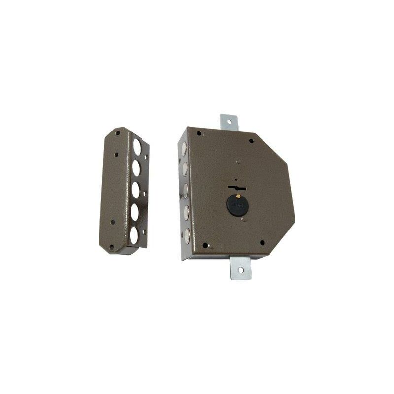 A doppia mappa. Chiusura triplice con catenaccio a 5 pistoni e 4 mandate, e predisposizione per fissaggio aste. Scatola Mm. 160x135. In acciaio verniciato marrone. In dotazione: 3 chiavi, 1 ferrogliera, 1 placchetta esterna, viti e minuteria.