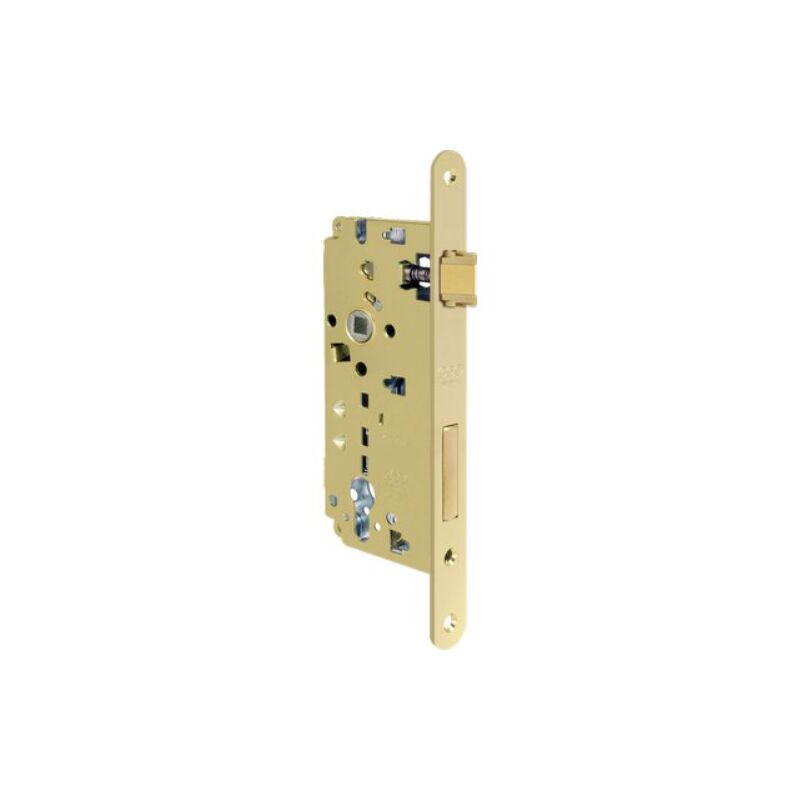 Serratura legno infilare 80851 agb B.t ottonato f.mm 22 f.sagom m2+scr+q8 e.mm 25 per cilindro sagomato. con scrocco brevettato co-stampato autolubrificante e catenaccio. chiusura con catenaccio a 2 mandate (1 mandata per le misure e mm. 20-25-30). quadro maniglia mm. 8. frontale con bordo tondo da mm. 22x212. altezza scatola mm. 170.