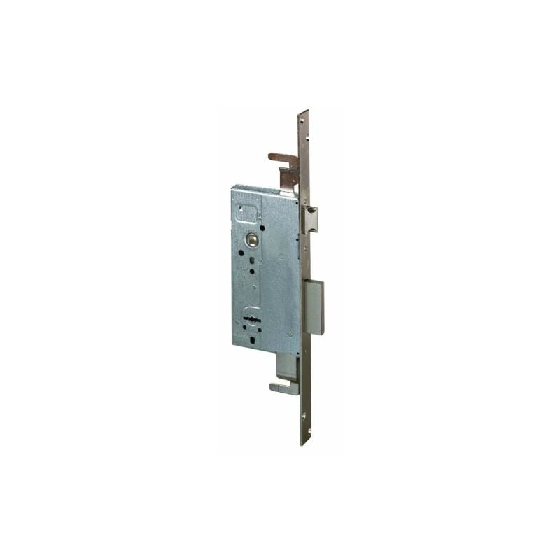 Serratura da infilare a doppia mappa. 2 mandate e scrocco, 3 punti di chiusura, con contropiastra e copritoppa, senza aste, 3 chiavi, scatole mm. 76/86x170.