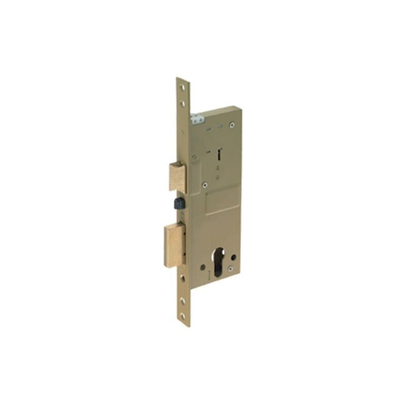 Per cilindro sagomato. Scrocco reversibile elettrificato 12V. Chiusura con catenaccio a 2 mandate. Frontale con bordo quadro da Mm. 22x264. Altezza scatola Mm. 183. In dotazione: 1 incontro, coppia contatti e viti di fissaggio.