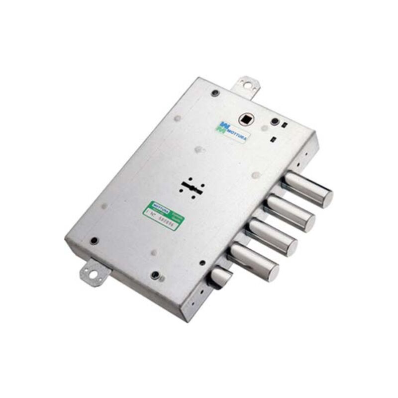 A doppia mappa. Scrocco reversibile, azionabile da chiave o maniglia. Chiusura triplice con catenaccio a 4 pistoni e 4 mandate, corsa Mm. 40, e predisposizione per fissaggio aste, corsa Mm. 20. Quadro maniglia Mm. 8, interasse Mm. 85. Scatola Mm. 136x206. In acciaio zincato. In dotazione: 3 chiavi.