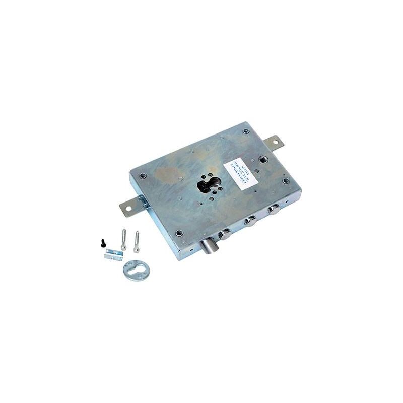 F.SAGOM M4 TRIPL+SCR IP.MM 28 E.MM 73 SXPer cilindro sagomato. Scrocco azionabile da chiave o maniglia. Chiusura triplice con catenaccio a 4 pistoni e 4 mandate, corsa Mm. 40, e predisposizione per fissaggio aste, corsa Mm. 18. Quadro maniglia Mm. 8, interasse Mm. 85. Scatola Mm. 142(150,5)x206. In acciaio zincato. In scatola.