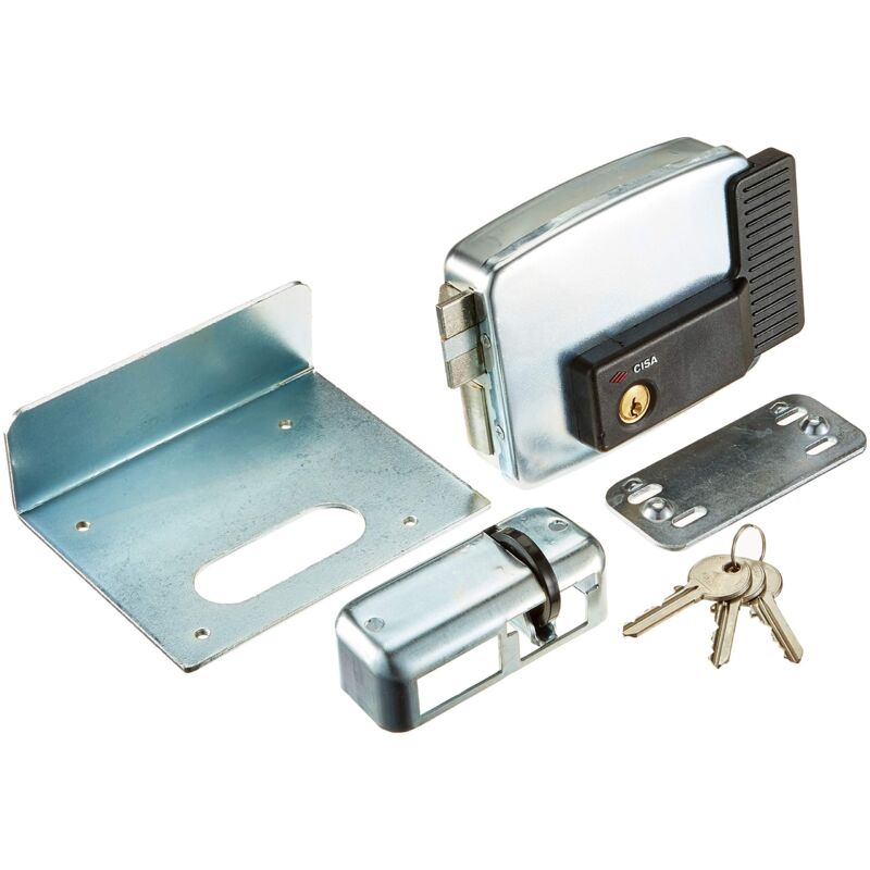 CISA SERRATURA METALLO APPLICARE ELETTRICA 11761 Cilindro esterno fisso Elettrica 12volt Con cilindro esterno fisso da Mm. 55 di lunghezza. occo autobloccante elettrificato 12V. Chiusura con catenaccio a 2 mandate. Completa di tettuccio protettivo e sottobocchetta.Scatola Mm. 128x106. Bocchetta Mm. 40x100. In acciaio zincato. In dotazione: 3 chiavi piatte, 1 bocchetta e viti di fissaggio.
