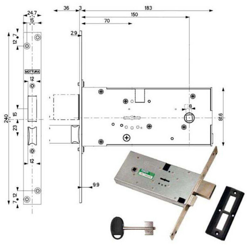 Serratura metallo infilare 41812 mottura Serratura metallo infilare 41812 mottura b.q zinc f.mm 25 dm m4+scr h.mm 82 e.mm 70 Caratteristiche Tecniche: - Serratura in metallo infilare con codice 41812 Mottura B.Q zincata, con dimensioni di 25mm di larghezza, 82mm di altezza e 70mm di spessore. Include cilindro di sicurezza M4+SCR e maniglia.