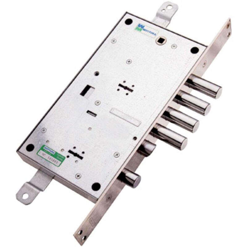 Mottura serratura metallo infilare 54795 Mano destra Doppio sistema di chiusura 3 chiavi incluse superiori e inferiori Mottura serratura metallo infilare 54795, Doppio sistema di chiusura a doppia mappa. Scrocco azionabile da chiave o maniglia. La parte superiore aziona la chiusura triplice con catenaccio a 4 pistoni e 4 mandate, corsa Mm. 40, e predisposizione per fissaggio aste, corsa Mm. 20. La parte inferiore aziona 1 catenaccio a 1 pistone e 2 mandate, corsa Mm. 18, e blocca la serratura superiore. Quadro maniglia Mm. 8, interasse Mm. 85. Frontale con bordo quadro da Mm. 35x356. Scatola Mm. 136x254. In acciaio zincato. In dotazione: 3 chiavi superiori. 3 chiavi inferiori, mostrine interne ed esterne.