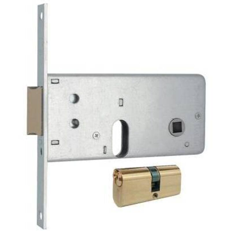 Con cilindro ovale. Con 2 mandate e scrocco, catenaccio in ottone. Scatola Mm. 134x64. Frontale a bordo quadro in acciaio zincato da Mm. 16x160. Quad... Con cilindro ovale. Con 2 mandate e scrocco, catenaccio in ottone. Scatola Mm. 134x64. Frontale a bordo quadro in acciaio zincato da Mm. 16x160. Quadro Mm. 8. Entrata Mm. 60. Con 3 chiavi piatte in dotazione.