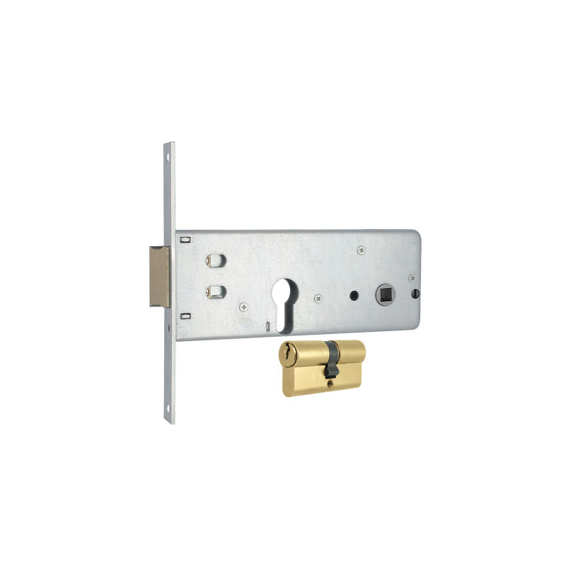 Con cilindro sagomato. A 2 mandate e scrocco, catenaccio in ottone. Scatola Mm. 164x64. Frontale a bordo quadro in acciaio zincato da Mm. 20x160. Quadro Mm. 8. Entrata Mm. 70. Con 3 chiavi piatte in dotazione.