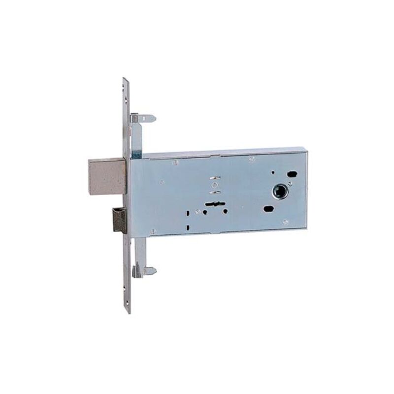 A doppia mappa. Scrocco reversibile. Chiusura triplice con catenaccio a 4 mandate e boccole filettate M8 per il fissaggio aste. Quadro maniglia Mm. 8. Frontale con bordo quadro in acciaio zincato da Mm. 25x240. Altezza scatola Mm. 82. In dotazione: 2 chiavi, 2 ghiere e viti di fissaggio.