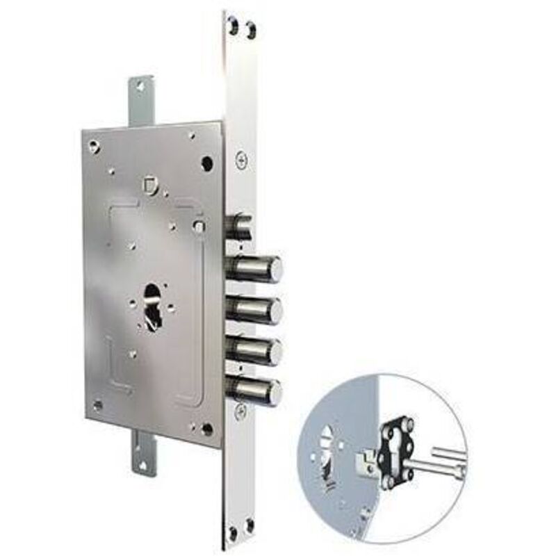 Per cilindro sagomato. Scrocco reversivile, azionabile da chiave o maniglia. Chiusura triplice con catenaccio a 4 pistoni e 2 mandate, corsa Mm. 29, e predisposizione per chiusura aste, corsa Mm. 16. Quadro maniglia Mm. 8, interasse Mm. 72. Frontale con bordo quadro da Mm. 35x367. Scatola da Mm. 142x227. In acciaio zincato. In dotazione: 1 posizionatore, 1 distanziale e viti.