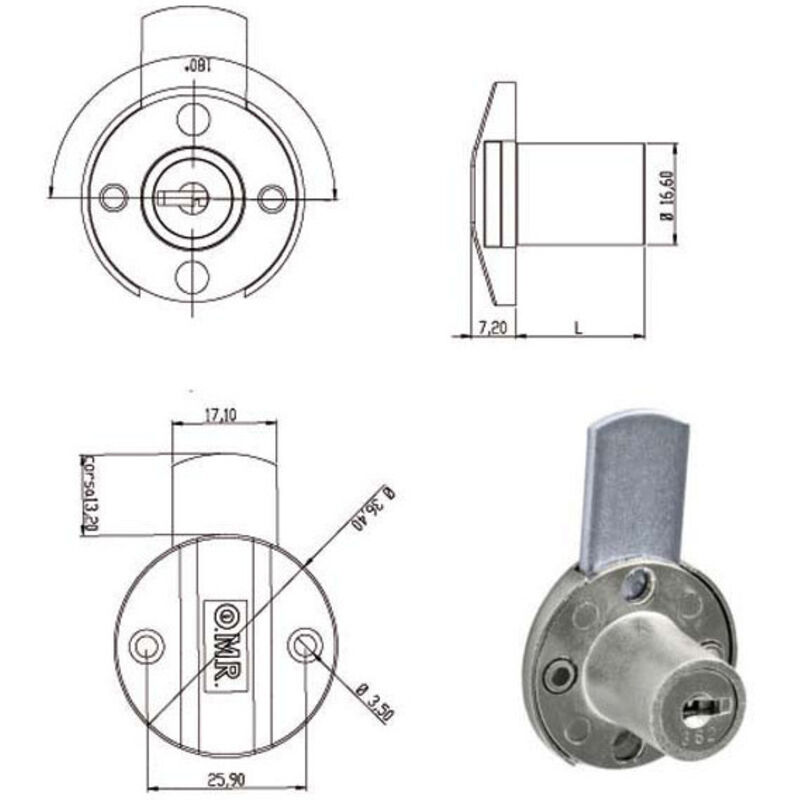 Serratura metallo pressofuso nichelato Applicazione antine 2 uscite chiave - Rotazione 180^ Chiusura catenaccio superiore corsa mm 13,2 Cilindro a spine mm 16,5 Dimensioni mm 36,4 2 chiavi