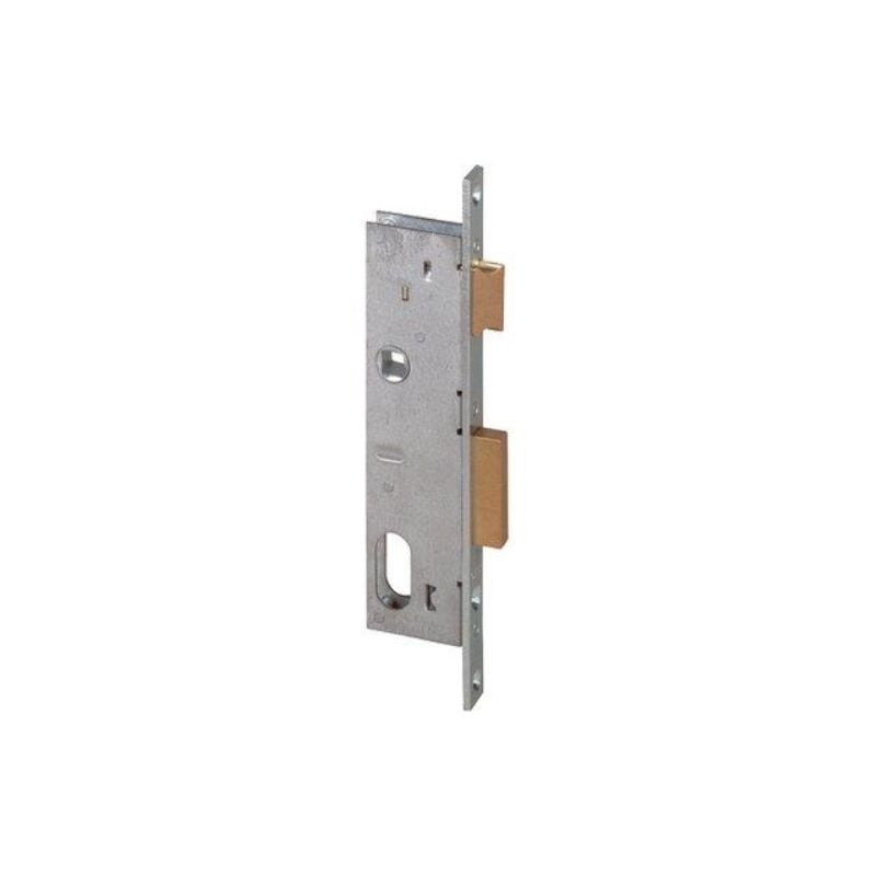 Serratura montante infilare 44225 cisa B.q zinc f.mm 16 f.ovale m2+scr+q8 e.mm 25 per cilindro ovale. scrocco reversibile. chiusura con catenaccio a 1 mandata. quadro maniglia mm. 8. lo scrocco è azionato anche dalla chiave ad eccezione delle serrature con entrata di mm. 15-18-25. frontale in acciaio zincato con bordo quadro da mm. 16x194. altezza scatola mm. 150. in dotazione: vite di fissaggio per cilindro.