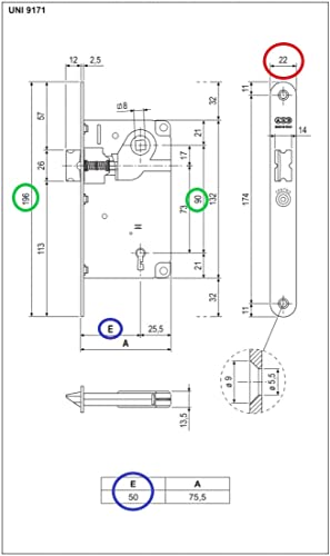Serratura AGB Fronte 22x196, Interasse 90, Entrata 50, Quadro 8. + Incontro Fronte Tondo 22x82 mm.
