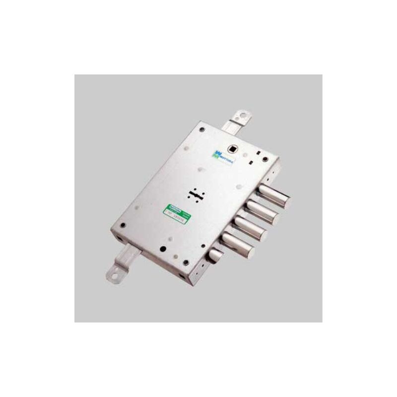 Triplice con mezzo giro reversibile, azionato da chiave e quadro maniglia mm.8, 4 mandate N. 4 chiavistelli tondi 18 con corsa mm.40, corsa aste mm.20. Scatola mm.136x206x30. Corredata da 3 chiavi a doppia mappa, mostrina interna e mostrina esterna. Serratura porte blindate a doppia mappa art. 52.571 mottura e63 MOTTURA Serrature ad applicare
