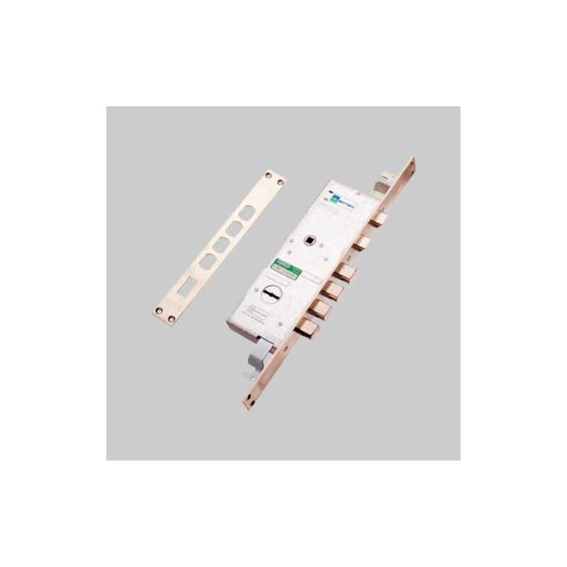 Triplice con mezzo giro azionato da chiave, quadro maniglia mm.8 ed elettricamente. N. 4 chiavistelli con corsa mm.18 a due mandate, corsa aste mm.17. Reversibile. Alimentazione 12V. Scatola mm.234x78x30. Ad infilare. Serratura porte blindate elettr. a dop.mappa art. 72.14ele mottura e47 MOTTURA Serrature ad applicare
