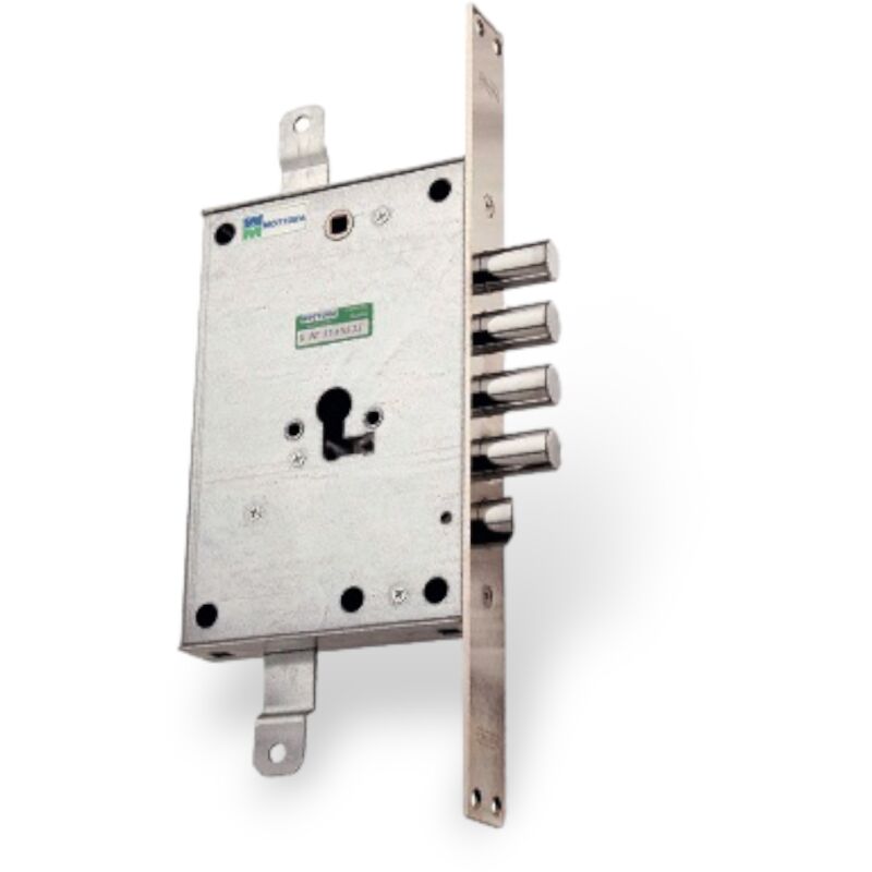 Caratteristiche: Serratura triplice con mezzo giro per cilindro ad infilare Mezzo giro Ø 20 azionato da cilindro e maniglia Ø 8 Entrata cilindro e maniglia 63 mm 2 mandate Corsa chiavistello 29 mm Catenacci tondi Ø 18. (Aste 20 mm. non in dotazione) Lato installazione: Mano destra interasse 28 - 4 Catenacci Mano sinistra interasse 28 - 4 Catenacci