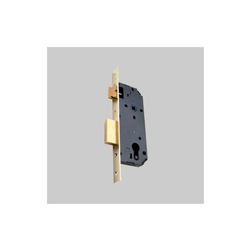 Bordi quadri. Scrocco reversibile e catenaccio a due mandate, quadro maniglia mm.8, interasse mm.85. Piastra e contropiastra in finitura ottonata. A infilare. Serratura per porte in legno serie 7435 viro e50 VIRO Serrature per porte in legno