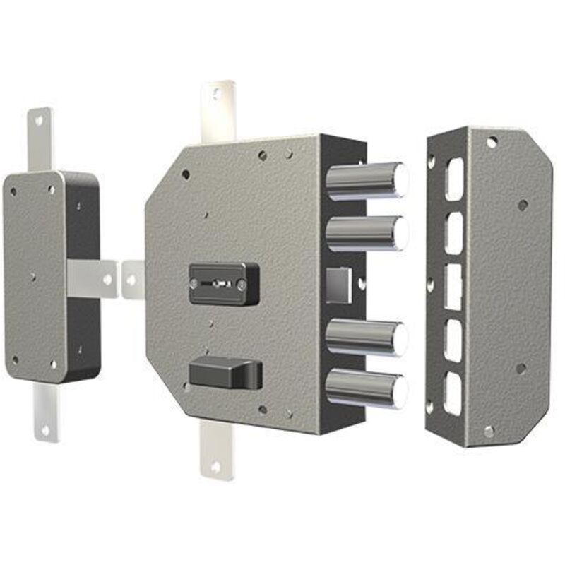 Doppia mappa, chiusura quintupla con scrocco e piastra corazzata, entrata chiave 61 mm., corsa catenacci 38 mm. Dispositivo NO Entry (Sistema di protezione concepito per opporsi ai più recenti metodi di apertura per manipolazione e rappresenta una vera barriera antintrusione). Dotazione 3 chiavi 116 mm.