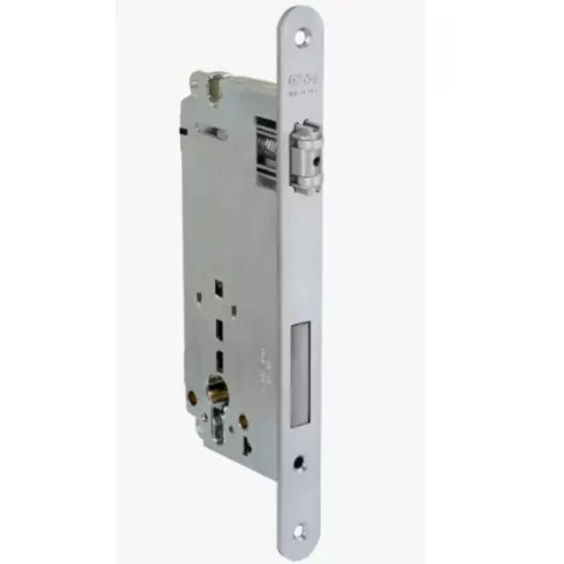 Serratura di sicurezza con foro per cilindro sagomato europeo e scrocco a rullo mod. AGB 851 con frontale a bordo tondo 22X238 mm. Disponibile con entrata da 50 mm. Finiture acciaio cromato opaco.
