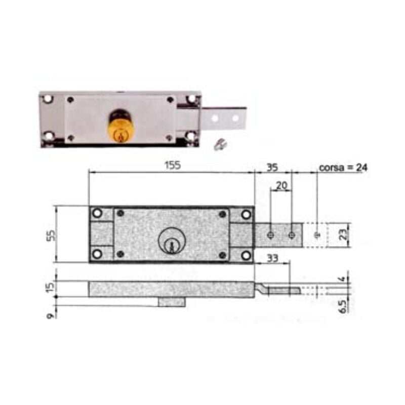 Sx mm.155x15x55h. (8233.9) scatola in acciaio zincato, catenacci rinforzati acciaio di spessore mm.2, ripegati su loro stessi in modo da ottenere uno spesore complessivo di mm.6.5 con perni per aggancio aste ø mm.9x8h. funzionamento ad ingranaggio, movimentazione con chiave, sia interna che esterna, cilindro tondo ø mm.25, dotazione 2 chiavi simmetriche Categoria merceologica: Serrature, chiusure di sicurezza e accessori - Sicurezza - Serrature per serranda