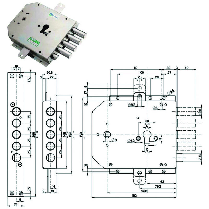 Scatola mm.182x159h. in acciaio con rivestimento in zinco, catenacci e scrocco in acciaio nichelato, 2 mandate - chiavistelli tondi ø mm.18 con corsa mm.29 - corsa aste mm.17 - serratura con mezzo giro ø 18 azionato da cilindro e maniglia - cilindro, rinforzi e aste non compresi