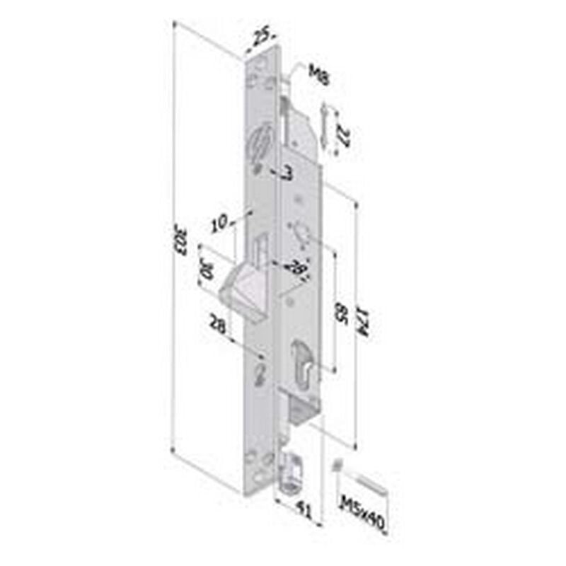 Scatola e frontale in acciaio zincato - serratura per grate e persiane a cilindro europeo - corsa aste mm.28 - funzionamento del catenaccio e delle aste ad ingranaggi comandate dal quadro maniglia e blocco tramite chiave a cilindro - fissaggio del cilindr