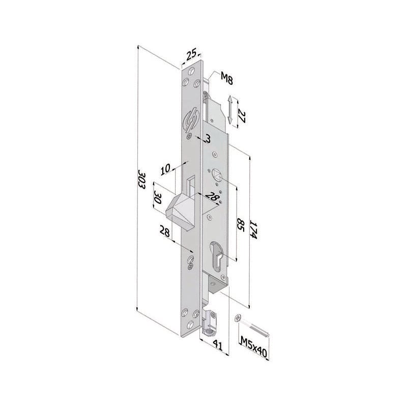 Scatola e frontale in acciaio zincato - serratura per grate e persiane a cilindro europeo - corsa aste mm.28 - funzionamento del catenaccio e delle aste ad ingranaggi comandate dal quadro maniglia e blocco tramite chiave a cilindro - fissaggio del cilindro con vite di testa - aste con attacco filettato M8 o ad innesto rapido - una linea robusta ed affidabile completamente intercambiabile con quelle in commercio ma con una maggior corsa delle aste e quindi una miglior sicurezza - cilindro non incluso