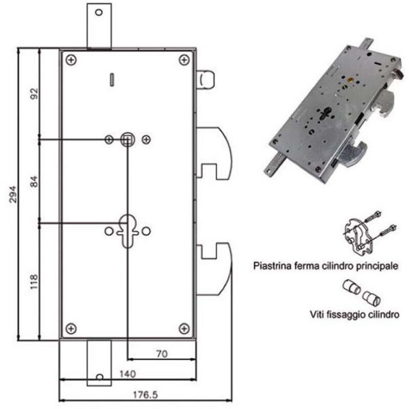 Serratura cilindro europeo a planare 2 chiusure verticali Chiusura 2 ganasce contrapposte e scrocco Misura scatola mm 140x294x30 - Entrata mm 70 Cilindro non incluso Staffa fissaggio cilindro e viti incluse