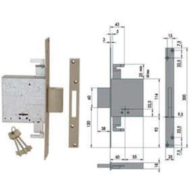 4 mandate, solo catenaccio, scatola in acciaio con rivestimento in zinco, frontale e contropiastra in acciaio satinato nichelato, catenaccio in acciaio nichelato, predisposizione per chiusure supplementari, dotazione 1 contropiastra frontale, 1 superiore, 2 piastrini guida prolunghe, bocchette interno ed esterno in ottone, 3 chiavi, aste non comprese