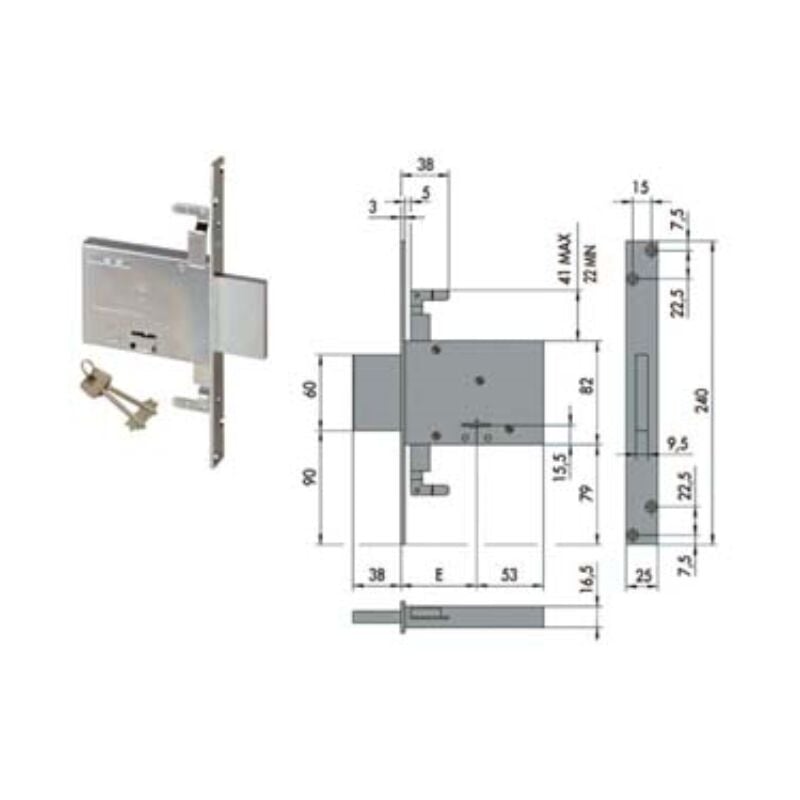 Mm.70 con 2 chiavi (57016700) scatola e frontale in acciaio con rivestimento in zinco, catenaccio in acciaio nichelato, predisposizione per chiusure supplementari, 4 mandate, dotazione borchia interna in acciaio, boccole filettate, aste non comprese, scatola mm.82h. Categoria merceologica: Serrature, chiusure di sicurezza e accessori - Sicurezza - Serrature a doppia mappa da infilare