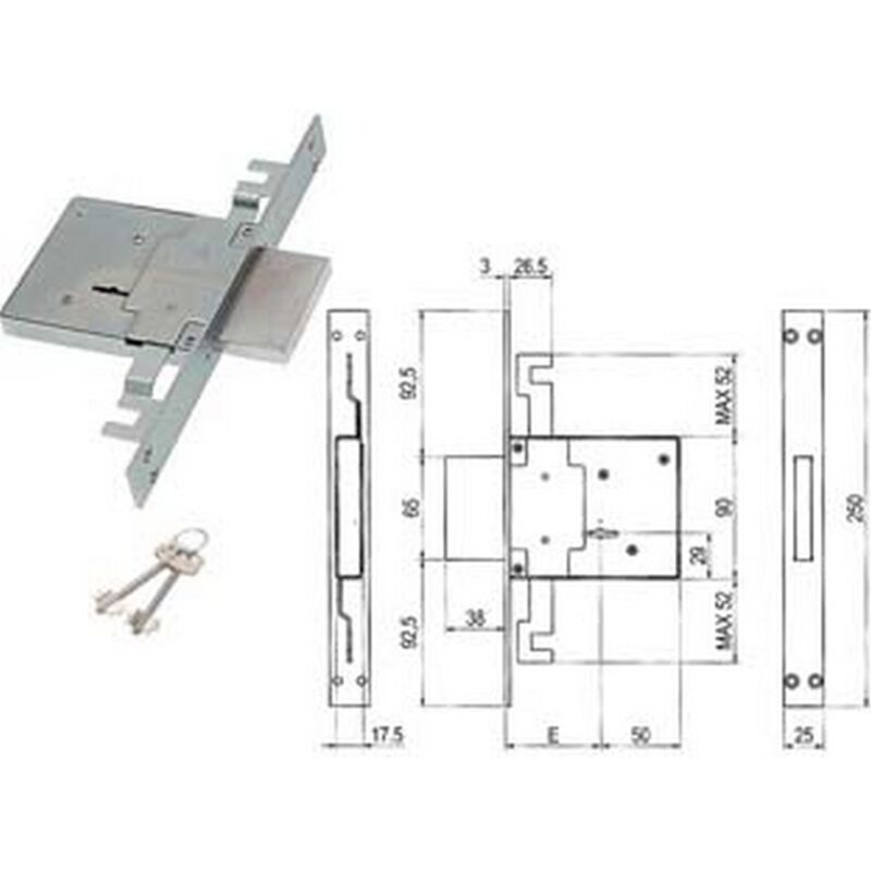 Scatola e coperchio in acciaio zincato - piastra frontale e contropiastra nichelate - catenaccio cromato - 4 mandate - triplice chiusura - in dotazione: contropiastra in acciaio nichelato, viti di montaggio, 2 chiavi cifrate, bocchette copritoppa in otton