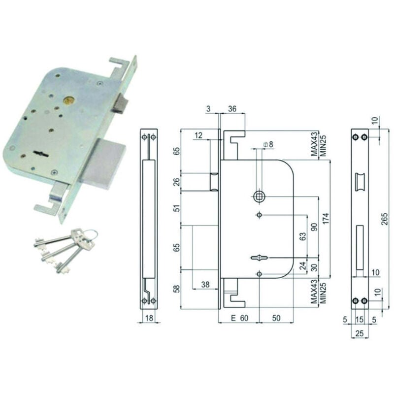Scatola e coperchio in acciaio zincato - piastra frontale e contropiastra nichelate - 4 mandate - triplice chiusura - catenaccio cromato - in dotazione: contropiastra in acciao nichelato, bocchette copritoppa in ottone, 3 chiavi, viti di fissaggio, 2 piastrine guida catenacciolo, contropiastrina catenacciolo superiore, pozzetto a pavimento, kit aste a richiesta