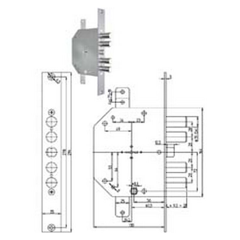 Scatola in acciaio zincato, catenacci e scrocco a pistoni con interasse mm.28 in acciaio cromato, reversibile, 4 mandate, quadro maniglia, dotazione: 2 mostrine dorate, viti e minuteria, 3 chiavi + 1 di cantiere, aste non comprese