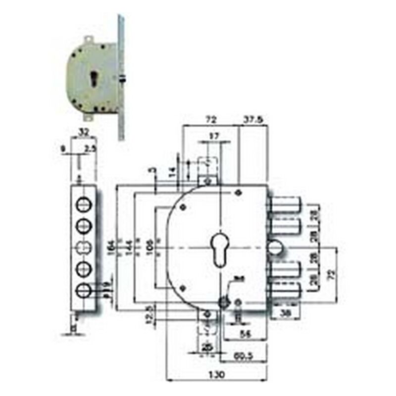 Scatola in acciaio zincato, fissaggio cilindro con sistema simply, catenacci e scrocco a pistoni con interasse mm.28 in acciaio cromato, 4 mandate, quadro maniglia, funzionante con cilindro a profilo europeo non compreso, dotazione: 2 mostrine dorate, vit