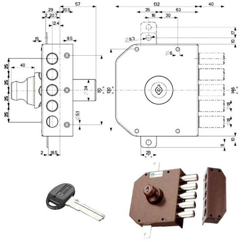 Serratura pompa applicare legno Doppia pompa esterna/interna 2 chiusure verticali Catenacci laterali 5 pistoni Misura scatola mm 132x146x30 - Entrata mm 63 Diametro cilindro mm 34 lunghezza mm 50 Aste non incluse 3 chiavi C10