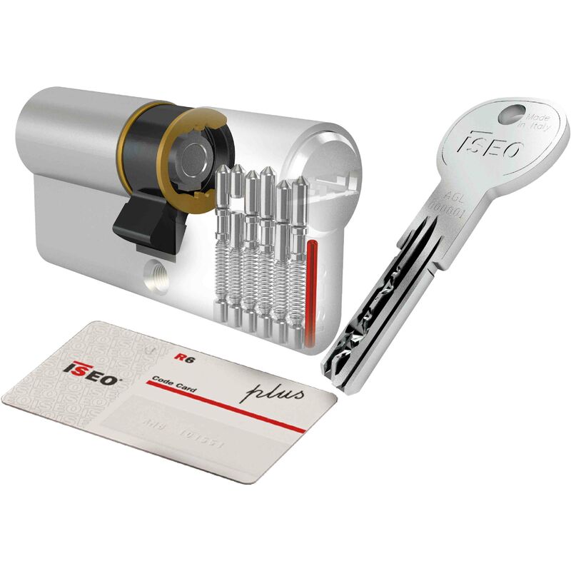 1,0 PZ Di ISEO R6 PLUS CILINDRO 5 CHIAVI 40X60 MM Mod. R6 PLUS sistema di chiusura di elevata resistenza alla torsione e alto numero di combinazioni. Sei pistoncini in acciaio inox. Con 5 chiavi in ottone sigillate + 1 chiave cantiere. Lunghezza 100 mm Misura mm 35.10.55 Finitura nichelata opaca No