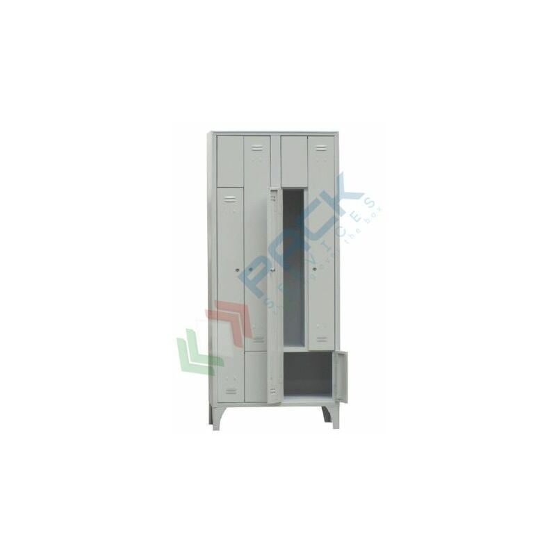 ARMADIETTO SPOGLIATOIO IN METALLO, SALVA SPAZIO CON ANTE A Z Armadietto spogliatoio salva spazio con ante a Z, su 4 piedini realizzato in lamiera dacciaio profilata prima scelta spessore 6/10. Armadietto spogliatoio salva spazio in metallo con ante a Z a 8 vani, 4 ripiani e 2 tramezzi divisori centrali, Mis. 800 L x 500 P x 1950 H mm. Armadio metallico spogliatoio con ante contrapposte per ottimizzare lo spazio. Vano calzature diviso da vano vestiario. Ante rinforzate dotate di feritoie di aerazione nella parte superiore ed inferiore e cerniere interne speciali antiscasso. Bordo frontale perimetrale arrotondato anti urto raggio 6 mm e nervature longitudinali su fianchi e porte. Armadio metallico con asole sul tetto per consentire unottima circolazione dellaria. La dotazione interna contenuta in ogni vano comprende: pianetto superiore con tubo ovale porta grucce in PVC e porta cartellino plastico applicato all'anta. Armadietto per palestra con corpo e ante nel colore grigio RAL 7035