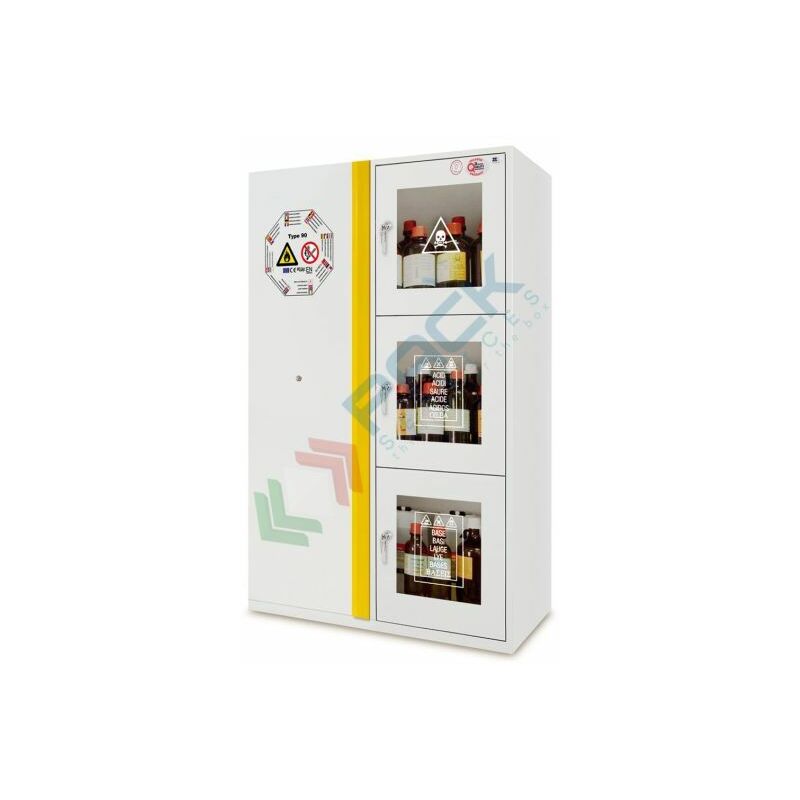 ARMADIO DI SICUREZZA COMBINATO PRODOTTI CHIMICI E INFIAMMABILI Armadio di sicurezza combinato per prodotti infiammabili, acidi, basi e sostanze tossiche Mis. esterne: 1200 L x 600 P x 1950 H mm, Mis. interne infiammabili: 496 L x 446 P x 1540 H mm, Mis. interne acidi/basi/sostanze tossiche: 3 x 590 L x 500 P x 880 H mm. Armadi per lo stoccaggio in sicurezza con 3 porte a vetro suddiviso in: ACIDI 2 ripiani in acciaio verniciato, BASI 2 ripiani in acciaio inox, SOSTANZE TOSSICHE 2 ripiani in acciaio verniciato, INFIAMMABILI 3 ripiani e 1 vasca di ritenzione con griglia in acciaio verniciato (carico max di 60 Kg distribuiti uniformemente). Capacità di stoccaggio 40 + 40 + 40 Lt (Acidi/basi/sostanze tossiche) 120 Lt (infiammabili). Colore grigio RAL 7035. Armadio di sicurezza combinato certificato per lo stoccaggio di prodotti infiammabili, chimici, acidi e basi e tossici secondo le norme EN 14470-1, EN 61010 e EN 14727. Stoccaggio separato di sostanze infiammabili (EN14470-1) e sostanze