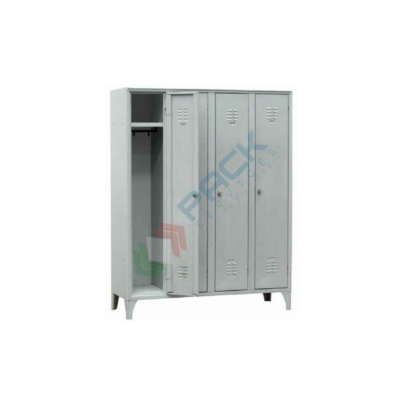 ARMADIETTO SPOGLIATOIO IN METALLO, MODELLO SALVA SPAZIO Armadietto spogliatoio salva spazio su 4 piedini realizzato in lamiera dacciaio profilata prima scelta spessore 6/10. Armadio spogliatoio 4 vani e 1 ripiano, Mis. 1200 L x 500 P x 1800 H mm. Armadio metallico spogliatoio con ante rinforzate dotate di feritoie di aerazione nella parte superiore ed inferiore e cerniere interne speciali antiscasso. Bordo frontale perimetrale arrotondato anti urto raggio 6 mm e nervature longitudinali su fianchi e porte. Armadio metallico con asole sul tetto per consentire unottima circolazione dellaria. La dotazione interna contenuta in ogni vano comprende: ripiano superiore con sottostante tubo ovale porta grucce in PVC completo di ganci scorrevoli, porta cartellino in materiale plastico applicato allanta. Armadietto per palestra con corpo e ante nel colore grigio RAL 7035 e sistema di chiusura con serratura a cilindro con doppia chiave in dotazione. Consegnato già montato. Trattamento delle