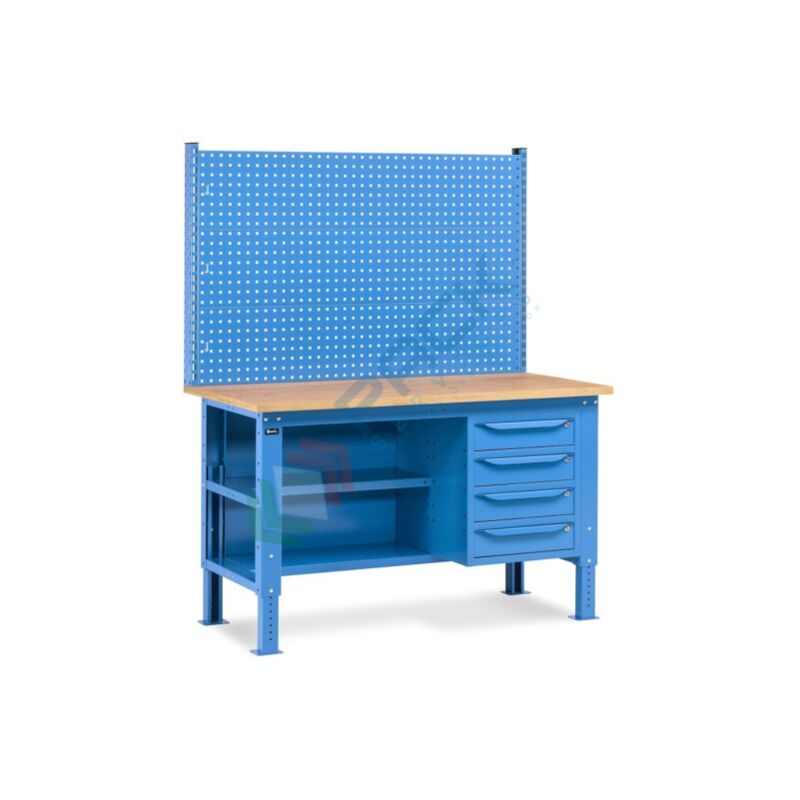 BANCO DA LAVORO GAMBE REGOLABILI CON PIANO IN LEGNO, 150 CM Banco da lavoro in acciaio, realizzato con piano in multiplex 30 mm, Mis. 1500 L x 750 P x 740/1110 H mm, con gambe regolabili in altezza. Carico massimo del prodotto 1000 Kg. Fornito smontato. Il banco con piano in legno è una soluzione ideale per effettuare operazioni pesanti. Con il banco regolabile in altezza l'operatore ha a disposizione numerose soluzioni per l'organizzazione di tutto il materiale per il lavoro: utensili e attrezzature maggiormente utilizzate possono essere sempre a portata di mano grazie al fissaggio di accessori e ganci sulla parete attrezzata, mentre componenti e ulteriori attrezzi possono essere custoditi in sicurezza nell'armadio a cassetti con serratura a cilindro. I due semipiani presenti nella parte sinistra del banco possono sostenere ulteriori elementi e consentono all'operatore di avere maggiore spazio per le gambe così da poter lavorare da seduto. Colore lamiera in acciaio blu RAL 5012.