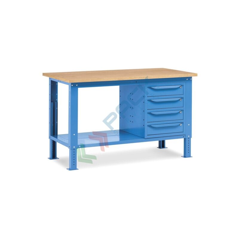 BANCO DA LAVORO GAMBE REGOLABILI CON PIANO IN LEGNO, 150 CM Banco da lavoro in acciaio, realizzato con piano in multiplex 30 mm, Mis. 1500 L x 750 P x 740/1110 H mm, con gambe regolabili in altezza. Carico massimo del prodotto 1000 Kg. Fornito smontato. L'altezza del banco da lavoro con piano in multiplex può essere facilmente variata meccanicamente per regolare il piano di lavoro non solo in base alle lavorazioni da effettuare, ma anche secondo l'altezza dell'operatore. Il banco con piano in legno è una soluzione ideale per effettuare operazioni pesanti. La parte inferiore presenta un armadio con 4 cassetti ed un piano per avere a disposizione più spazi per l'organizzazione di tutto il necessario per il lavoro. Colore lamiera in acciaio blu RAL 5012. Caratteristiche tecniche: DIMENSIONI: Larghezza: 1500 mm / Profondità: 750 mm / Altezza: 740/1110 mm PORTATA: Carico massimo del prodotto: 1000 kg MATERIALE: Lamiera in acciaio verniciato blu RAL 5012. TIPOLOGIA: Regolabile in altezza