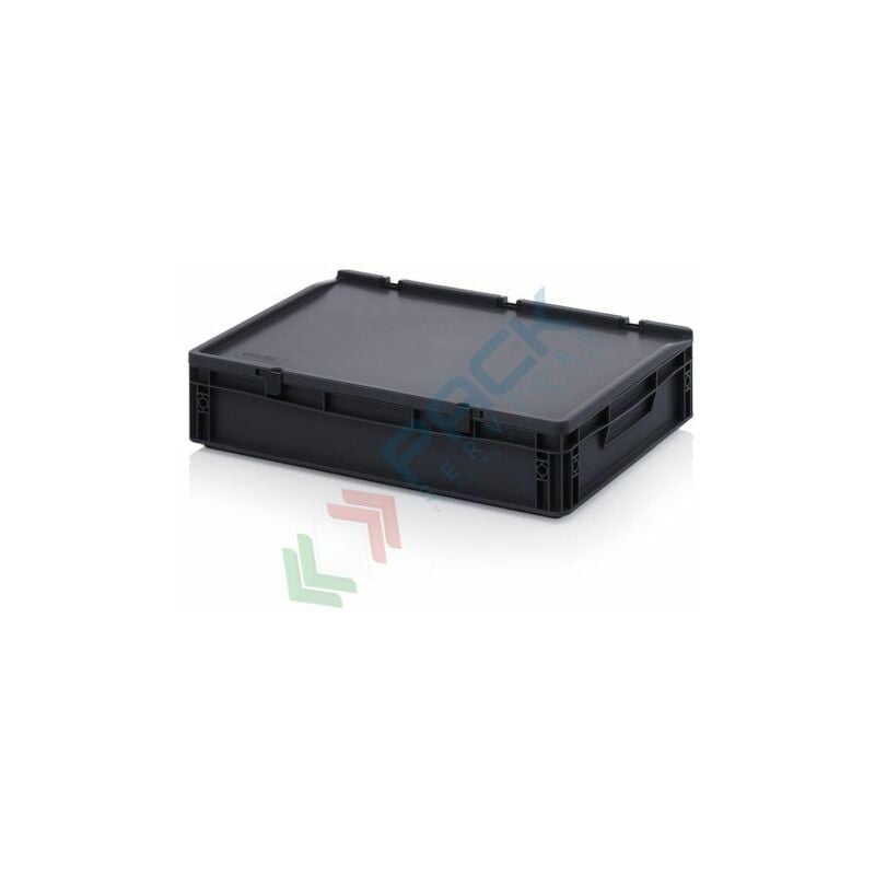 CASSETTA IN PLASTICA ANTISTATICA E CONDUTTIVA Contenitore in plastica, conduttivo e antistatico, capacità 24 Lt, Mis. esterne 600 L x 400 P x 135 H mm, Mis. interne 570 L x 370 P x 115 H mm. Cassetta in plastica sovrapponibile, norma Europa, con coperchio integrato. La cassa in plastica, il coperchio e la cerniera sono realizzati in materiale sintetico conduttivo, quindi adatti per l'immagazzinaggio e il trasporto in sicurezza di merce elettronica. Cassetta di plastica impilabile anche con coperchio, robusta e fornita in tutti i formati Euro attuali. Il coperchio è incluso e fornisce maggiore protezione al contenuto. Base e pareti chiuse, maniglie chiuse. Cassetta conduttiva e antistatica in polipropilene (PP), NON idonea al contatto alimentare. Con l'utilizzo di contenitori antistatici si evitano cariche elettrostatiche;
