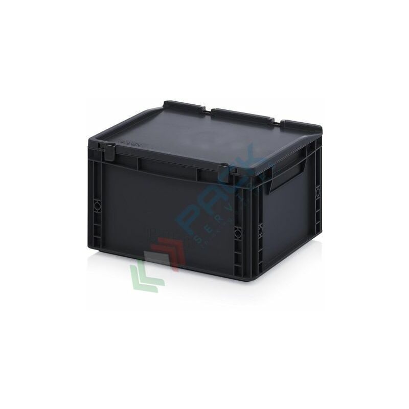 CASSETTA IN PLASTICA ANTISTATICA E CONDUTTIVA Contenitore in plastica, conduttivo e antistatico, capacità 20 Lt, Mis. esterne 400 L x 300 P x 235 H mm, Mis. interne 370 L x 270 P x 205 H mm. Cassetta in plastica sovrapponibile, norma Europa, con coperchio integrato. La cassa in plastica, il coperchio e la cerniera sono realizzati in materiale sintetico conduttivo, quindi adatti per l'immagazzinaggio e il trasporto in sicurezza di merce elettronica. Cassetta di plastica impilabile anche con coperchio, robusta e fornita in tutti i formati Euro attuali. Il coperchio è incluso e fornisce maggiore protezione al contenuto. Base e pareti chiuse, maniglie chiuse. Cassetta conduttiva e antistatica in polipropilene (PP), NON idonea al contatto alimentare. Con l'utilizzo di contenitori antistatici si evitano cariche elettrostatiche;