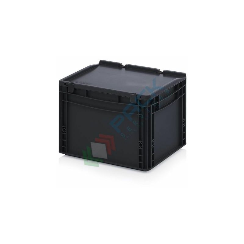 CASSETTA IN PLASTICA ANTISTATICA E CONDUTTIVA Contenitore in plastica, conduttivo e antistatico, capacità 26 Lt, Mis. esterne 400 L x 300 P x 285 H mm, Mis. interne 370 L x 270 P x 255 H mm. Cassetta in plastica sovrapponibile, norma Europa, con coperchio integrato. La cassa in plastica, il coperchio e la cerniera sono realizzati in materiale sintetico conduttivo, quindi adatti per l'immagazzinaggio e il trasporto in sicurezza di merce elettronica. Cassetta di plastica impilabile anche con coperchio, robusta e fornita in tutti i formati Euro attuali. Il coperchio è incluso e fornisce maggiore protezione al contenuto. Base e pareti chiuse, maniglie chiuse. Cassetta conduttiva e antistatica in polipropilene (PP), NON idonea al contatto alimentare. Con l'utilizzo di contenitori antistatici si evitano cariche elettrostatiche;