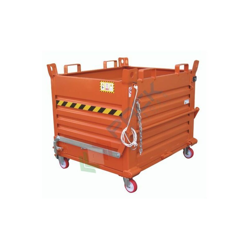 CONTENITORI A FONDO APRIBILE Cassone in metallo a fondo apribile, con 4 ruote (2 piroettanti e 2 fisse), Mis. 1500 L x 1000 P x 1034/1144 H mm, ad elevata portata (portata 1350 Kg). Le ruote del contenitore a fondo apribile sono realizzate in superlan, diametro 150 mm, supporto pesante con mozzo a cuscinetto, portata cadauna 450 Kg. Le ruote consentono di spostare il contenitore metallico con facilità e di semplificare la chiusura del fondello dopo lo svuotamento. Le ruote sono realizzate con sistema di blocco per evitare aperture accidentali. Il contenitore a fondello unico prevede un meccanismo di apertura realizzato in lamiera di acciaio zincata per offrire una maggiore resistenza alla corrosione. Il cassone in metallo dispone di maniglioni di inforcazione fissi che permettono di sollevare il contenitore senza scendere dal carrello elevatore. Cassone fondo apribile in lamiera ideale per la raccolta, movimentazione e lo scarico di rifiuti, sfridi e rottami in tutta sicurezza.