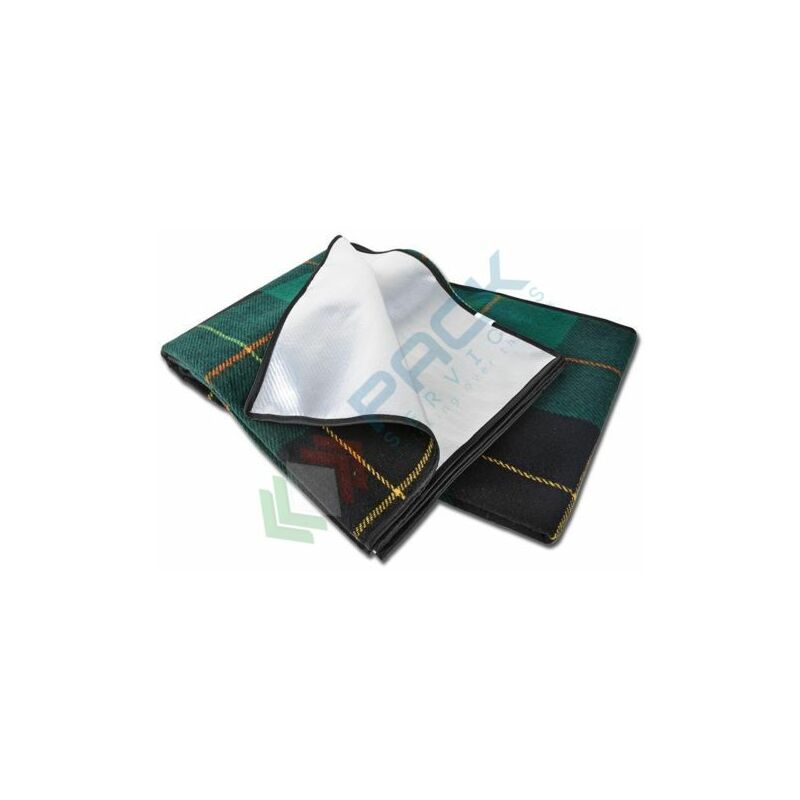 Coperta d'emergenza multiuso, Mis. 150 x 200 cm, in tessuto 100% poliestere sul lato superiore e film di alluminio sul lato inferiore plastificato, accoppiati per fusione, con bordi in poliestere nero. Lavabile, impermeabile e inattaccabile da microrganismi e muffe. In funzione del lato utilizzato protegge dal caldo o dal freddo. Può essere utilizzata in una vasta gamma di impieghi: come coperta d'emergenza nelle escursioni, in campeggio, da tenere in auto, ecc... Colore verde.