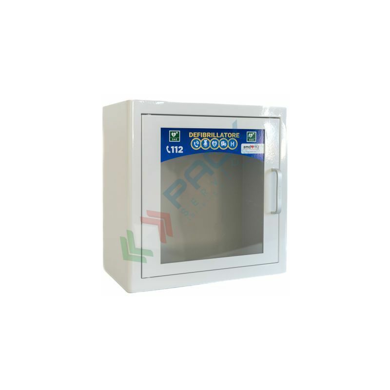 TECA PER DEFIBRILLATORE DAE, IDEALE PER INTERNI Teca per defibrillatore in acciaio, Mis. 360 L x 360 P x 200 H mm, elegante e funzionale, ideale per la collocazione di un defibrillatore DAE in ambienti interni ad accesso pubblico di un edificio, scuole, palestre, studi medici, uffici privati e pubblici. Larmadietto per defibrillatore offre una qualità superiore a tutte le analoghe proposte di contenimento per ambienti interni presenti sul mercato. La teca per DAE è dotato di chiusura magnetica, allarme di apertura a batteria con 3 livelli di regolazione, elegante maniglia di apertura cromata. La teca per defibrillatore è verniciata a polvere e realizzata con spigoli arrotondati per garantire i massimi livelli di durata e sicurezza. È adatta a qualsiasi tipo di defibrillatore. Colore bianco. Caratteristiche tecniche: Robusto armadietto in metallo stondato Ideale per ambienti interni come uffici Verniciatura a polvere uniforme Maniglia in alluminio Include materiale di fissaggio e