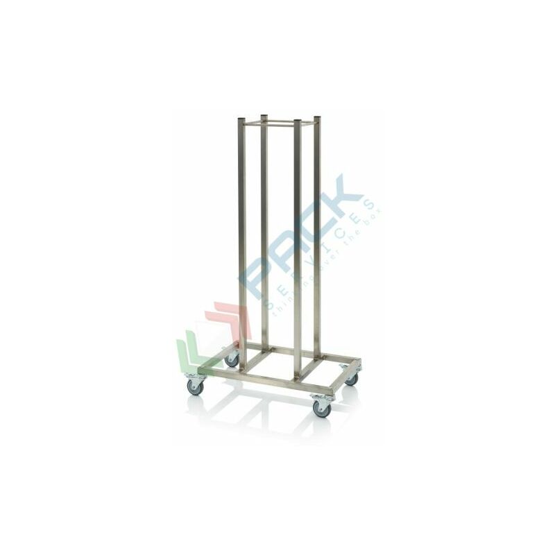 Carrello per carrellini da trasporto di cassette norma Europa, Mis. 600 L x 410 P x 1180 H mm, con 4 ruote. Struttura di impilaggio che può ospitare fino a 15 carrelli impilati senza ingombro. Struttura in acciaio inox con 4 ruote sterzanti con arresto ruota scorrevoli con battistrada in santoprene per la movimentazione del carrello in modo particolarmente delicato e silenzioso.