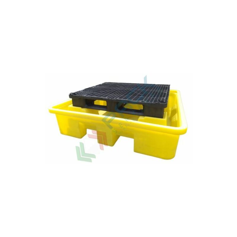 Vasca di sicurezza per lo stoccaggio di 4 fusti da 200 Lt realizzata in polietilene (PE) atossico stabilizzato U.V. di colore giallo, roto-stampata, monolitica ovvero stampata in unico pezzo senza giunzioni. Vasca di contenimento con Mis. 1550 L x 1600 P x 360 H mm, portata massima 1000 Kg (statico uniformemente distributo). Vasca di sicurezza con struttura auto portante e rinforzata per resistere agli urti, resistente agli agenti chimici e dotata di una griglia di appoggio in polipropilene (PP) Mis. 1200 x 1200 mm. Vasche di contenimento impilabili.
