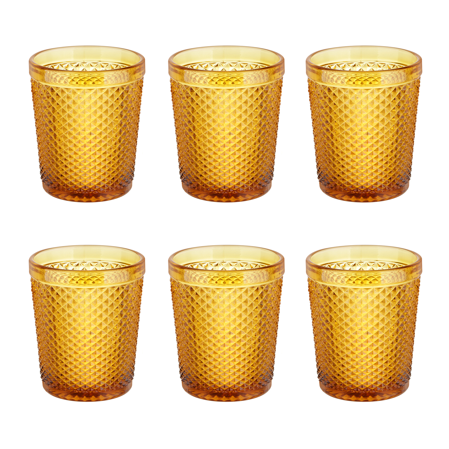 Sono i dettagli che rendono bella e unica la tua tavola! Prova ad aggiungere, accanto ai piatti, questo servizio di bicchieri in vetro: creerà suggestivi giochi di luce e riflessi grazie ai decori in rilievo. Pensato per acqua e bevande, è ideale per apparecchiare una tavola per 6 persone con cura e il tocco colorato del vetro color ambra. I bicchieri hanno capacità 360 ml e sono lavabili in lavastoviglie.