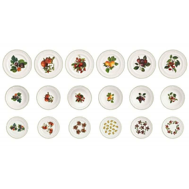 Misure: -piatto piano: cm d 27 -piatto fondo: cm d 21,5 -piattino: cm d 20,5 Materiale: new bone china Peso set: 10 kg c.ca Idoneità lavastoviglie: si Idoneità forno: si Idoneità microonde: si Idoneità freezer: si Caratteristiche: - set 18 pezzi: 6 piatti piani, 6 piatti fondi, 6 piattini -sinuosi bordi irregolari -decori di frutta su ogni piatto
